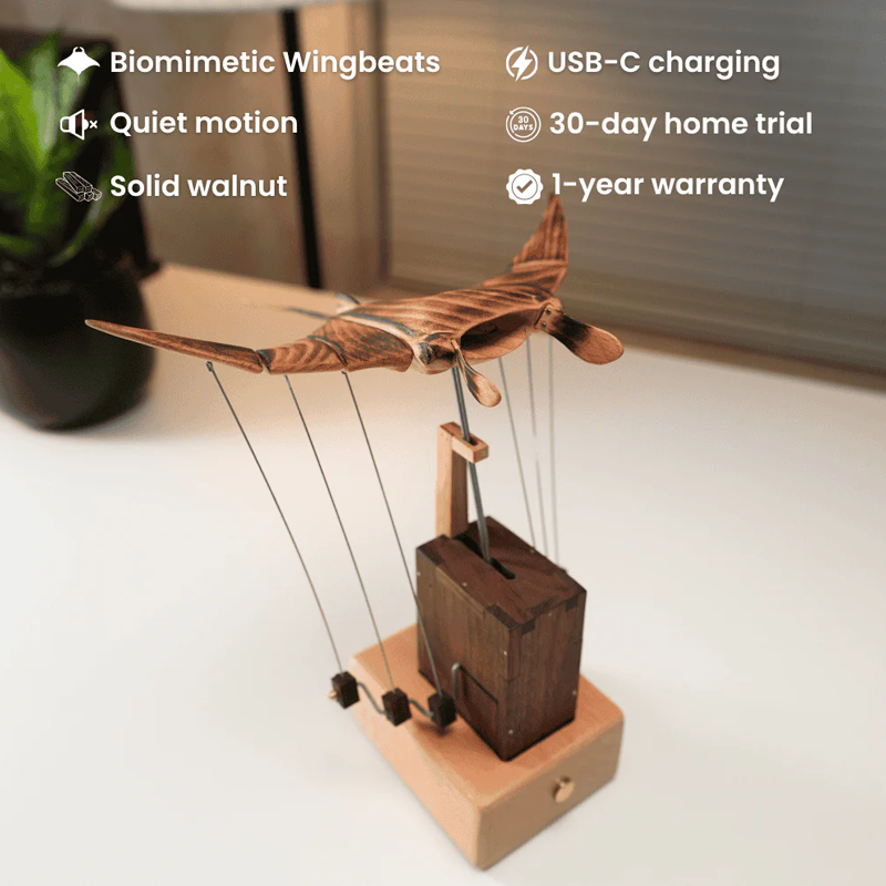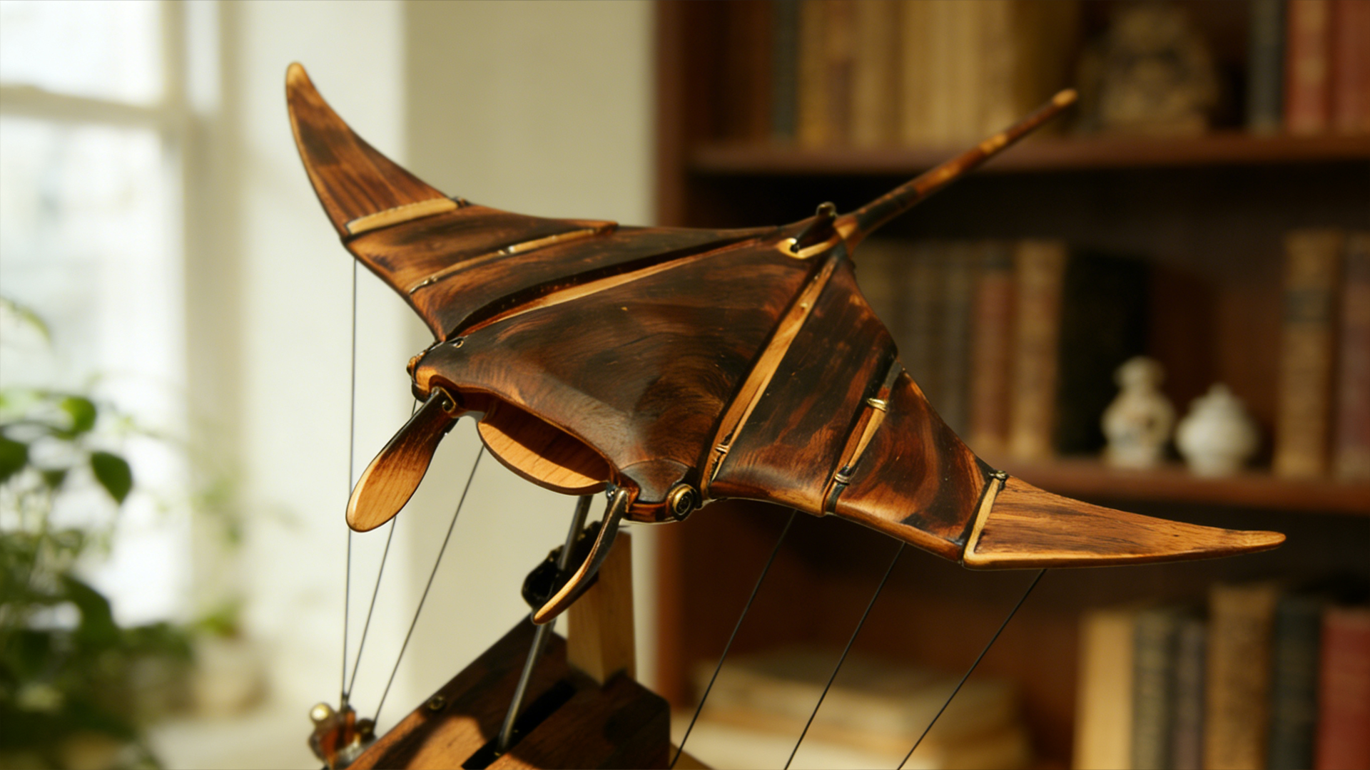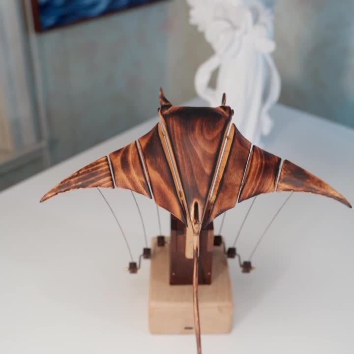 Witness the ocean’s grace on your desk. Our walnut manta ray glides with interlocking gears, turning motion into calm — a kinetic poem of the sea and human craft.